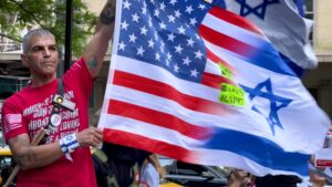 NEW YORK, NEW YORK – JUNE 13: A pro-Israel counter demonstrator holds a Half American Half Israeli Flag as demonstrators rally outside Citigroup's headquarters, accusing Citibank of financially supporting the Israel-Palestinian war, on June 13, 2024 in New York City. Pro-Palestinian activists allege that the multibillion-dollar arms transactions between the Israeli Occupation Forces and the US Department of Defense are financed by Citigroup. During a Global Week of Action against Citigroup, activists enco