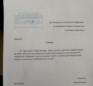 EKSKLUZIVE | Tetova1 siguron dokumentin: Deputeti Rijad Shaqiri kërkesë vetëm në gjuhën maqedone pas tensionit me Nikoloskin