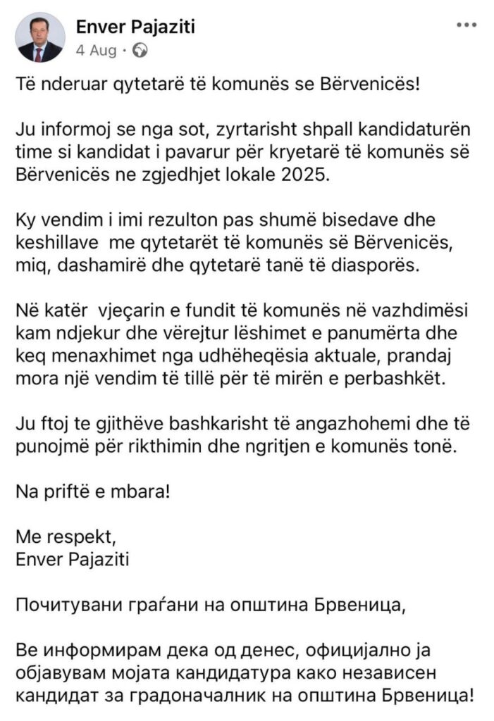 Para një muaji, Enver Pajaziti shpalli zyrtarisht kandidaturën e tij si kandidat i pavarur për kryetar të komunës së Bërvenicës në zgjedhjet lokale të vitit 2025. Në njoftimin e tij publik, ai kishte theksuar se ky vendim ishte rezultat i konsultimeve me qytetarët, miqtë dhe diasporën, duke theksuar se kandidimi i tij vinte si reagim ndaj keqmenaxhimeve dhe lëshimeve të shumta të udhëheqësisë aktuale komunale.
