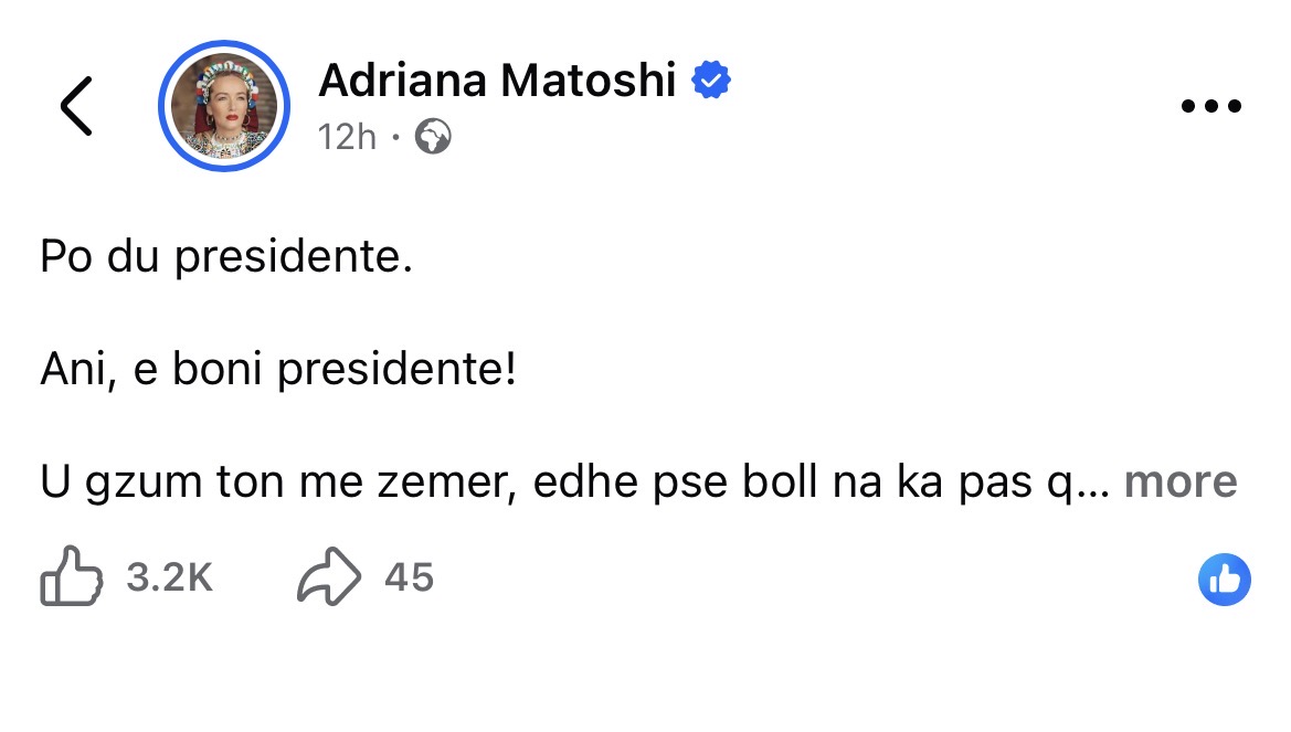 Deputetja e Vetëvendosjes, Adriana Matoshi, ka kritikuar presidenten Vjosa Osmani, lidhur me çështjen e zgjedhjes së presidentit të ri, post për të cilën, Osmani ka shfaqur synimet e saj edhe për një mandat të dytë.