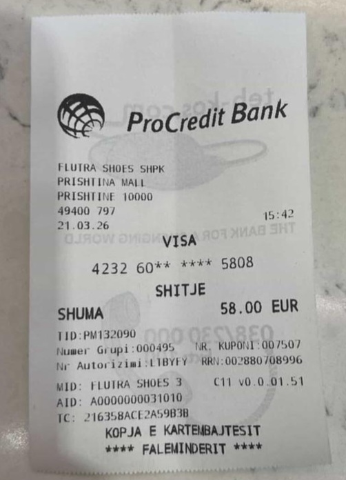 Lajmi i i tillë është i pavërtet dhe kjo dëshmohet edhe me faturën e datës 21 mars 2026, në të cilën shihet çmimi i blerjes në vlerë 58 euro në Prishtina Mall.