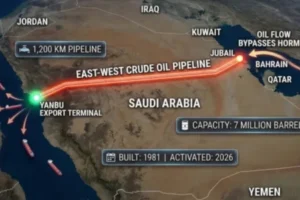 Ky tubacion ka një kapacitet deri në 7 milionë fuçi naftë në ditë dhe u ndërtua pikërisht për të garantuar eksportet saudite edhe në rast krizash në Hormuz. Infrastruktura ka qëndruar për dekada si një alternativë strategjike dhe tani mund të përdoret për të devijuar eksportet drejt Detit të Kuq.