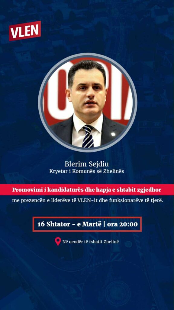 Më 16 shtator, në ora 20:00, koalicioni VLEN do të bëjë hapjen e Shtabit Zgjedhor në Komunën e Zhelinës, ku njëkohësisht do të promovohet kandidatura e Blerim Sejdiut për mandatin e tij të tretë si kryetar komune.