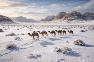 Pjesët shkretinore dhe malore të Arabisë Saudite u zbardhën me një shtresë dëbore që mbuloi disa rajone, duke i shndërruar malet e rrethuara nga shkretëtira në një vend të mrekullueshëm dimëror. Moti i ftohtë dhe shirat e rrëmbyeshëm sollën reshje dëbore në disa nga qytetet.