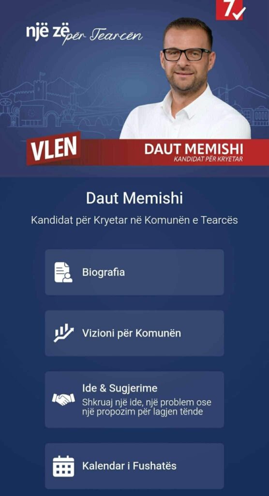 Kandidati i koalicionit VLEN për Komunën e Tearcës, Daut Memishi, ka prezantuar sot web faqen zyrtare www.dautmemishi.com, një platformë bashkëkohore që synon të afrojë qytetarët me administratën komunale.