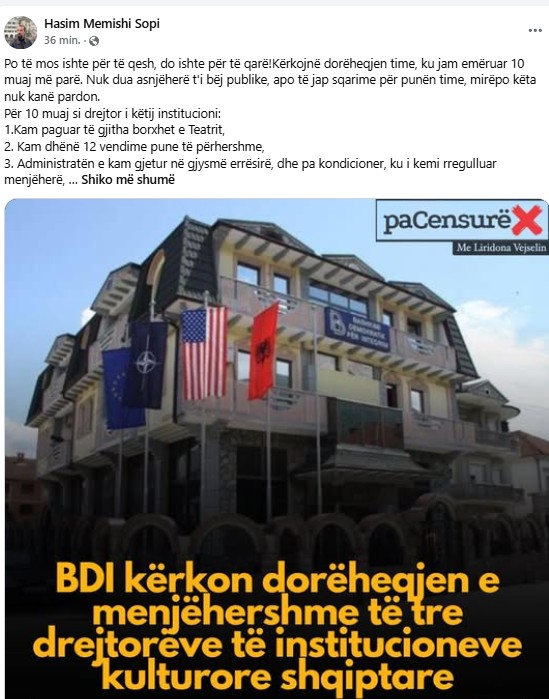 “Po të mos ishte për të qeshur, do ishte për të qarë! Kërkojnë dorëheqjen time, ku jam emëruar 10 muaj më parë. Nuk dua të bëj publike apo të jap sqarime për punën time, mirëpo këta nuk kanë pardon,” ka deklaruar drejtori.