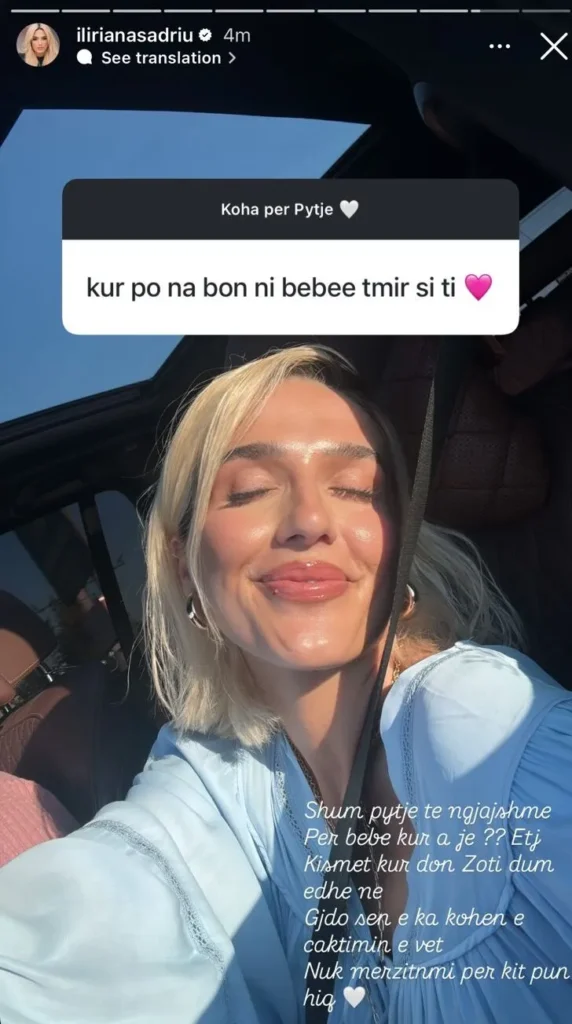 Këngëtarja e njohur nga Kosova, Iliriana Sadriu, ka vendosur t’u përgjigjet hapur ndjekësve të saj në Instagram, të cilët shpesh e pyesin për planet e saj për të pasur një fëmijë.