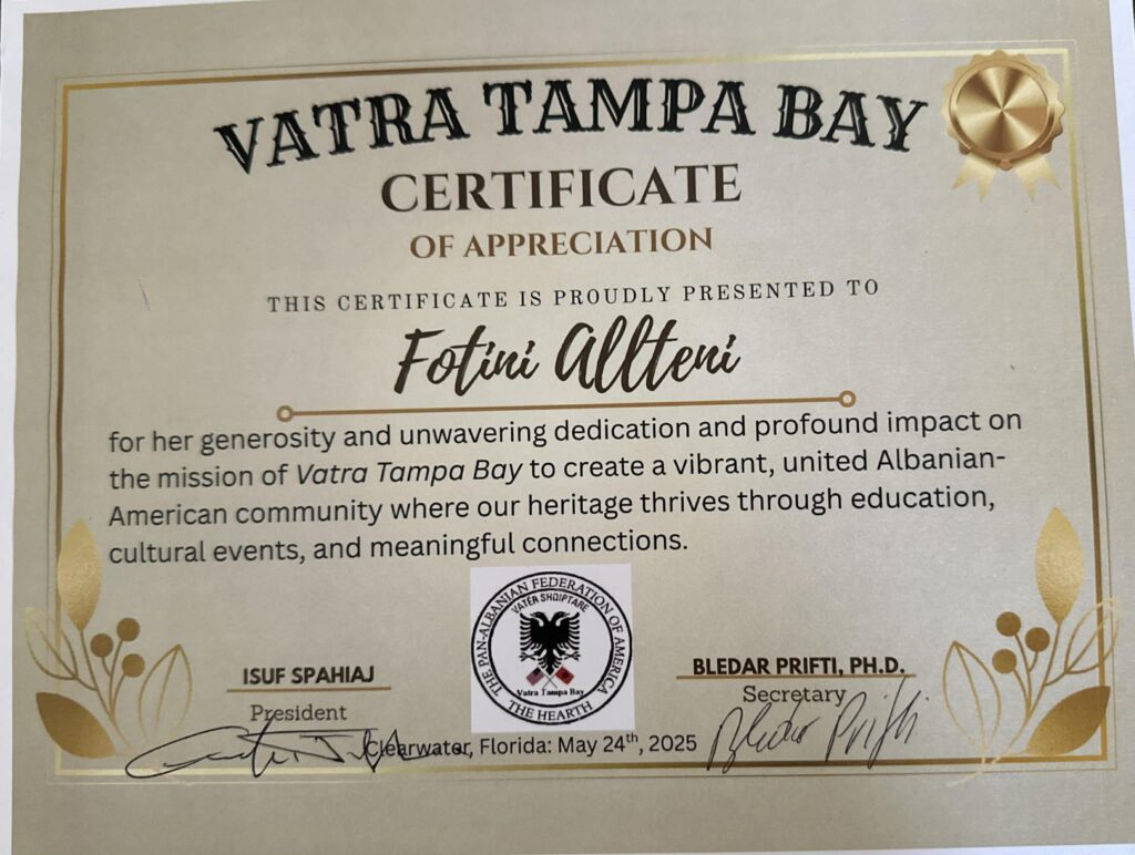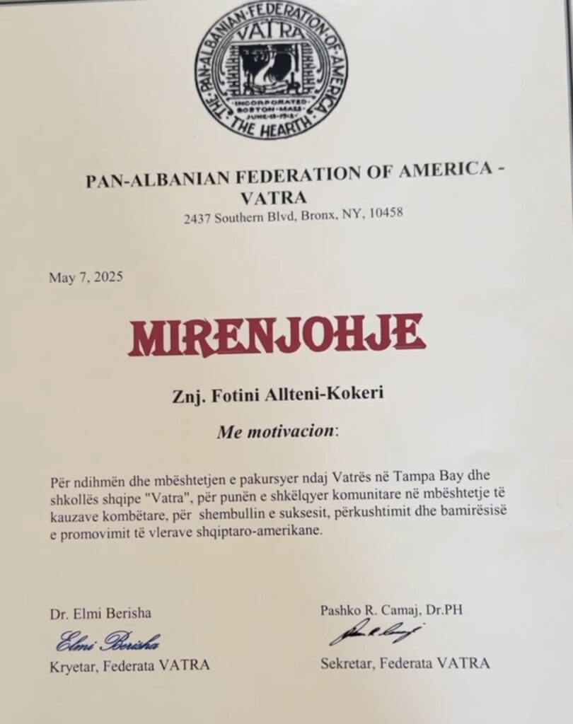 Filantropja e mirënjohur shqiptare, Fotini Allteni Kokeri, është nderuar në New York me çmimin prestigjioz “Nëntori Shqiptar”, një vlerësim që u jepet personaliteteve që kanë kontribuar në mënyrë të jashtëzakonshme për komunitetin shqiptar dhe promovimin e vlerave tona kombëtare në Shtetet e Bashkuara.