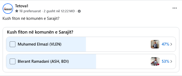 Zgjedhjet lokale po afrohen dhe dinamika politike nëpër komuna po intensifikohet dita-ditës. Një nga komunat ku pritet një garë interesante është Komuna e Sarajit, ku tashmë kanë nisur të qarkullojnë emrat e kandidatëve që synojnë postin e kryetarit. Në këtë kontekst, platforma online “Tetova1” ka realizuar një sondazh 24-orësh, të dedikuar posaçërisht për këtë komunë, për të matur preferencat e qytetarëve midis dy kandidatëve kryesorë: Blerand Ramadani nga Fronti Evropian, kuadër i Aleancës për Shqiptarët së udhëhequr nga Arben Taravari, dhe Muhamed Elmazi nga koalicioni VLEN.