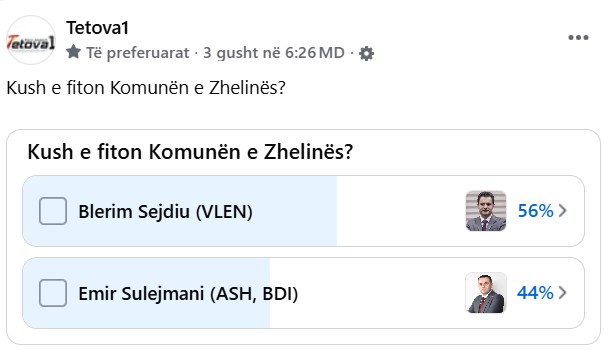 Në këtë kontekst, platforma online “Tetova1” ka zhvilluar një sondazh 24-orësh për të matur preferencat e qytetarëve të Zhelinës. Sipas të dhënave të publikuara, kandidati i VLEN-it, Blerim Sejdiu, gëzon për momentin një epërsi të lehtë me 56% të mbështetjes, përkundrejt 44% të votave që ka marrë kandidati i BDI-së, Emir Sulejmani.