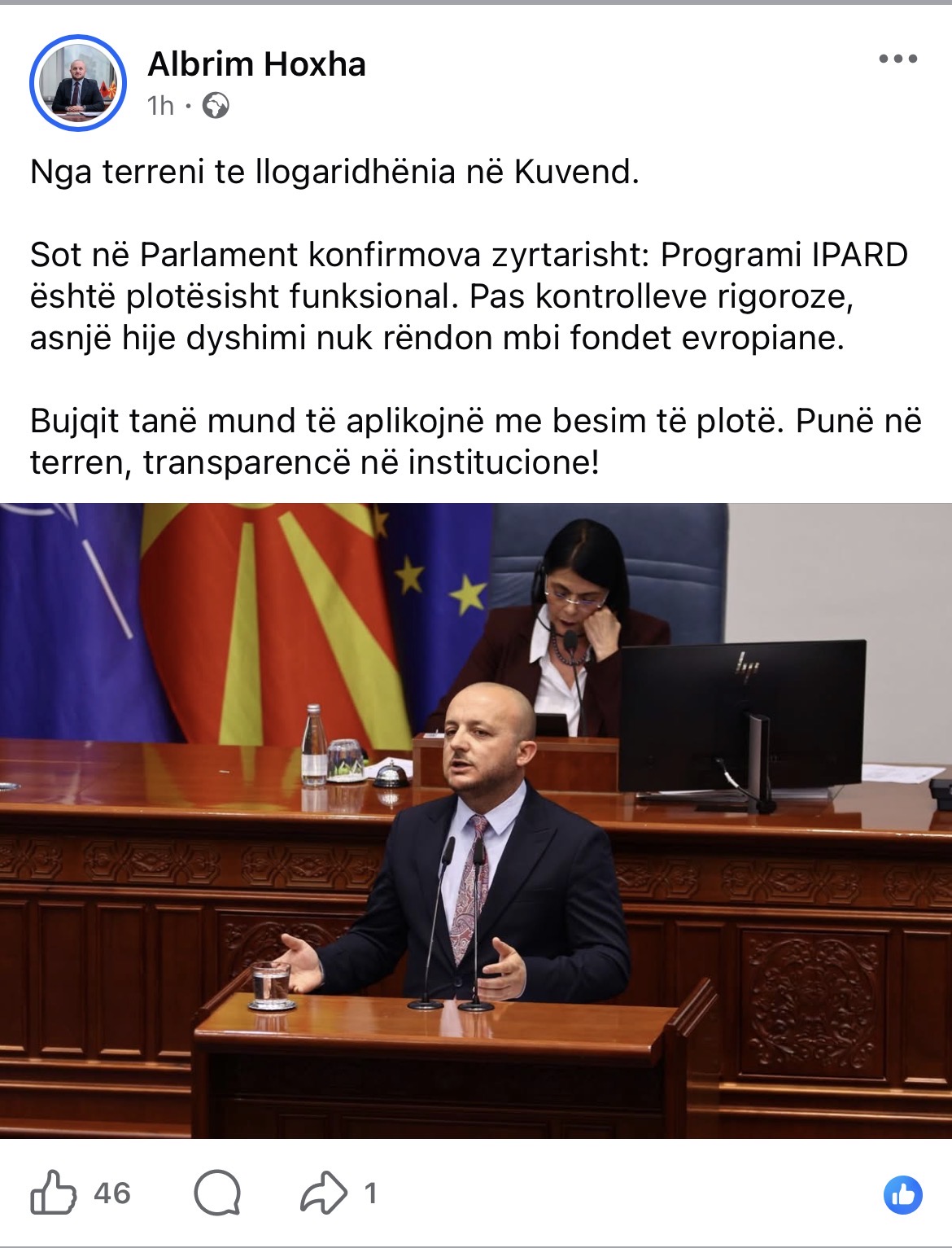 Zëvendësministri i Bujqësisë, Albrim Hoxha ka njoftuar nga Kuvendi se programi IPARD është tashmë plotësisht funksional dhe se, pas kontrolleve të kryera, nuk ekziston asnjë dyshim mbi menaxhimin e fondeve evropiane, përcjell tetova1