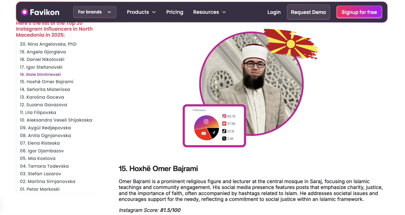 Imami nga Saraji Omer Bajrami është renditur në vendin e 15-të në listën e 20 influencerëve më të ndjekur në Instagram në Maqedoninë e Veriut për vitin 2025, sipas një klasifikimi të publikuar së fundi mbi ndikimin e krijuesve të përmbajtjes në rrjetet sociale në vend, përcjell Zyrtare.