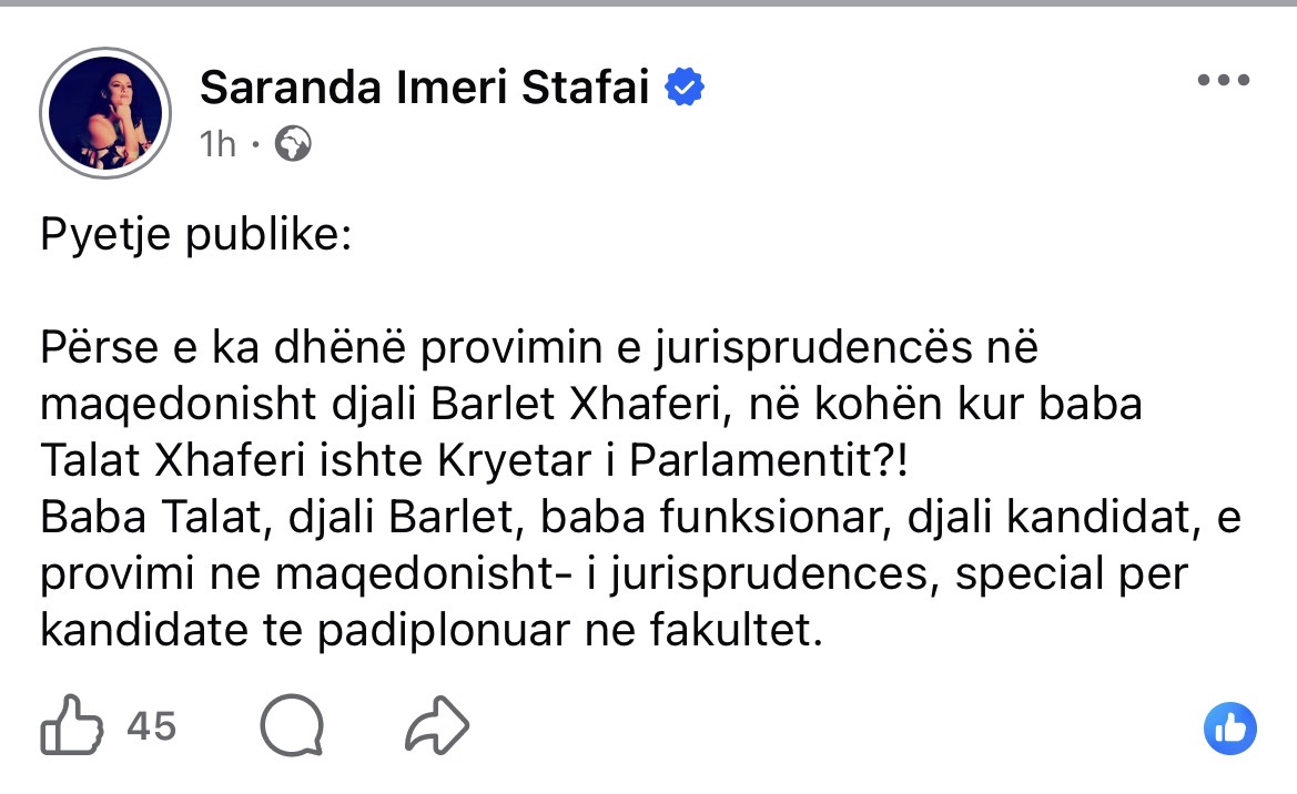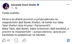 Deputetja Saranda Imeri Stafai ka reaguar përmes një postimi, duke drejtuar pyetje publike lidhur me dhënien e provimit të jurisprudencës nga djali i ish-kryeparlamentarit dhe deputetit të BDI-së, Talat Xhaferi, përcjell tetova1