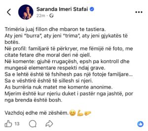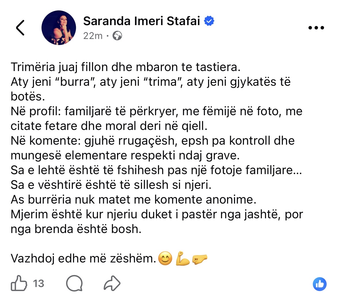 Në reagimin e saj, ajo vë në pah kontrastin mes imazhit që individët paraqesin në profilet e tyre dhe mënyrës së komunikimit në komente, duke theksuar se “trimëria” e tyre kufizohet vetëm pas tastierës. Sipas saj, shumë prej tyre paraqiten si familjarë të përkryer dhe me vlera të larta morale, por në komentet online përdorin gjuhë fyese dhe mungesë respekti.
