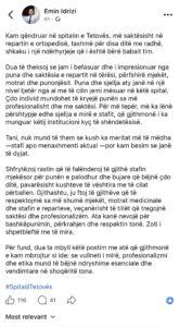 Për fund, dua ta mbyll këtë postim me atë që gjithmonë e kam mbrojtur si ide: se vullneti i mirë, profesionalizmi dhe etika mund të bëjnë ndryshime esenciale dhe vendimtare në shoqëritë tona”, ka përfunduar Idrizi./tetova1.mk/