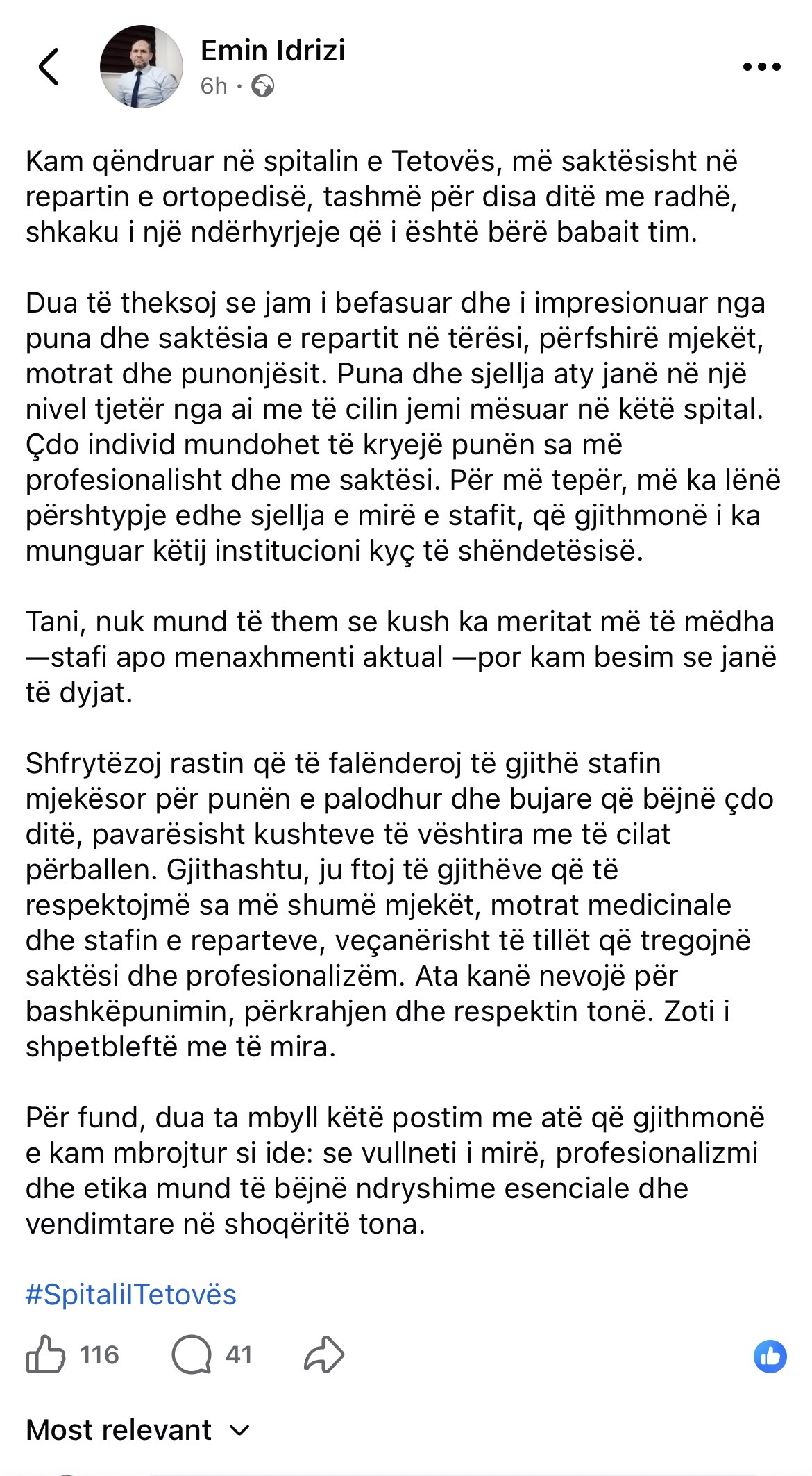 Dua të theksoj se jam i befasuar dhe i impresionuar nga puna dhe saktësia e repartit në tërësi, përfshirë mjekët, motrat dhe punonjësit. Puna dhe sjellja aty janë në një nivel tjetër nga ai me të cilin jemi mësuar në këtë spital. Çdo individ mundohet të kryejë punën sa më profesionalisht dhe me saktësi. Për më tepër, më ka lënë përshtypje edhe sjellja e mirë e stafit, që gjithmonë i ka munguar këtij institucioni kyç të shëndetësisë.