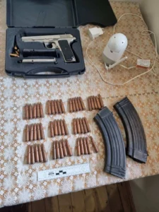 “Më 15.07.2025, në bazë të një urdhri gjyqësor, u krye bastisje në shtëpinë ku banon I.H., e cila është pronë e babait të tij, gjatë së cilës u gjetën dhe u konfiskuan një armë zjarri gjysmëautomatike “Red Flag M57″ me kalibër 7.62x25mm me dy presa fishekësh të kalibrit 7.62x25mm, fishekë të kalibrit 7.65mm dhe dy presa fishekësh me gjithsej 50 fishekë të kalibrit 7.62x39mm”.