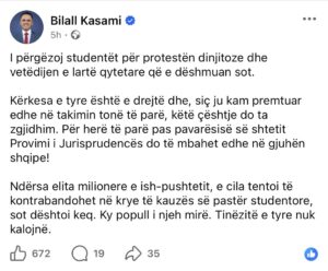 Ndërsa elita milionere e ish-pushtetit, e cila tentoi të kontrabandohet në krye të kauzës së pastër studentore, sot dështoi keq. Ky popull i njeh mirë. Tinëzitë e tyre nuk kalojnë”, ka shkruar Kasami.