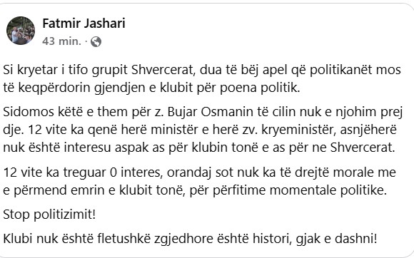 Kryetari i tifo-grupit “Shvercerat”, Fatmir Jashari, ka dalë me një apel publik duke kërkuar nga politikanët që të mos e keqpërdorin situatën e klubit për përfitime politike.