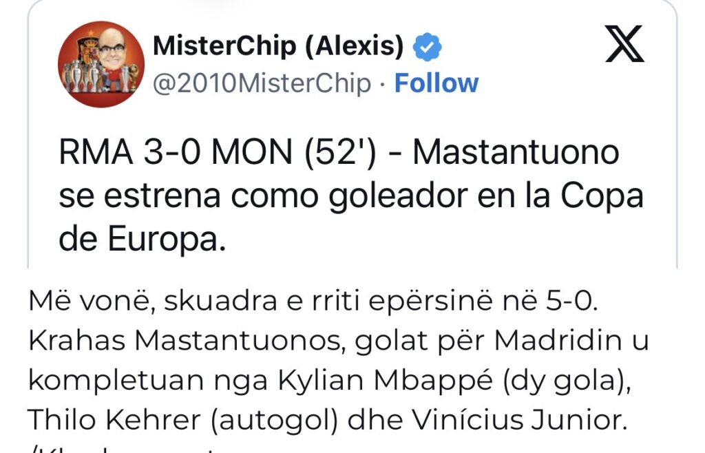 Sipas MisterChip, mesfushori argjentinas Franco Mastantuono është tani lojtari i tretë më i ri që shënon për Real Madridin në Ligën e Kampionëve: ai është 18 vjeç e 159 ditë, pas vetëm Endrick (18 vjeç, 58 ditë) dhe Raúl (18 vjeç, 113 ditë).