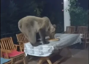 Videoja e publikuar tregon ariun duke u ngjitur në tavolinë dhe duke ngrënë nga një pjatë me ushqim. Pak më vonë, pasi i vuri re personat, ikën me vrap.