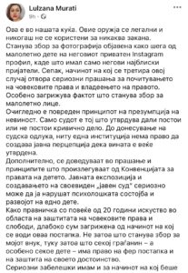 “Është e qartë se është shkelur parimi i prezumimit të pafajësisë. Vetëm gjykata është ajo që përcakton nëse ekziston apo jo një vepër penale. Deri në marrjen e një vendimi gjyqësor, asnjë institucion nuk ka të drejtë të krijojë perceptim publik sikur faji tashmë është vërtetuar”, thekson Murati.