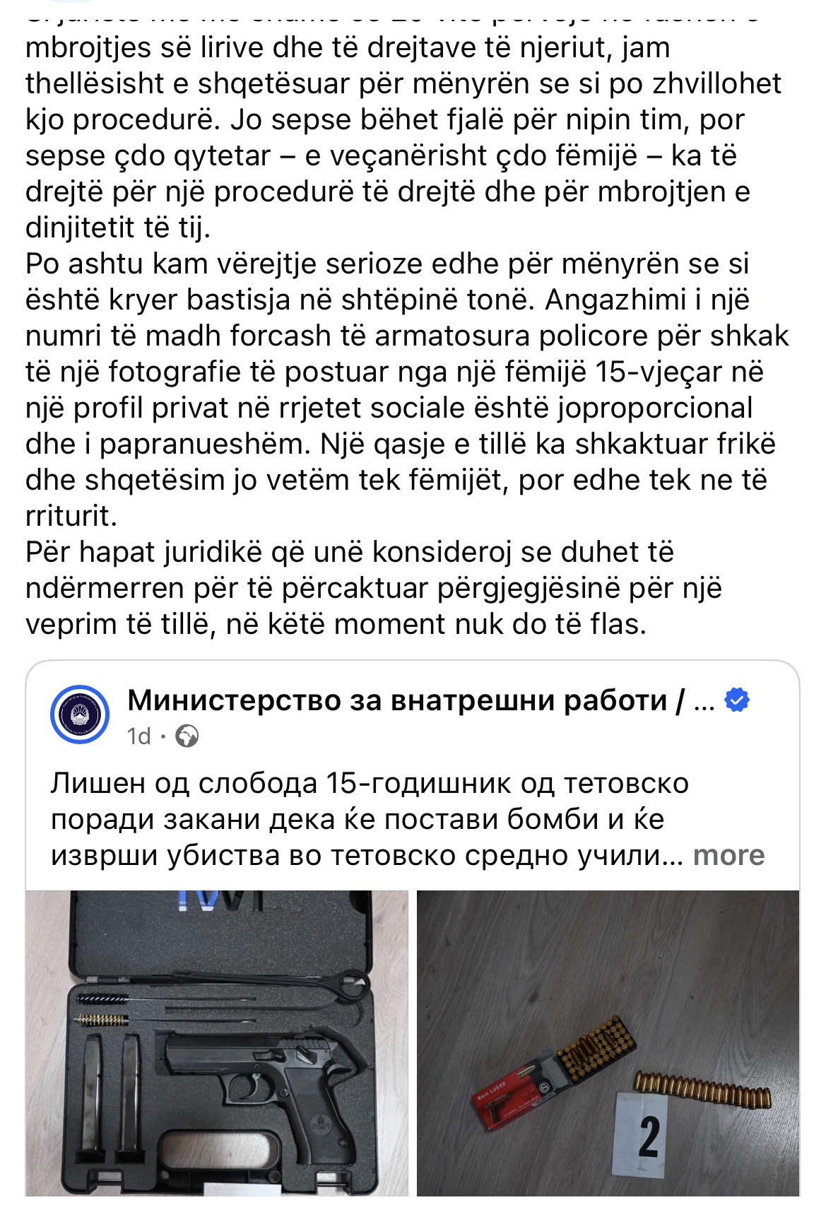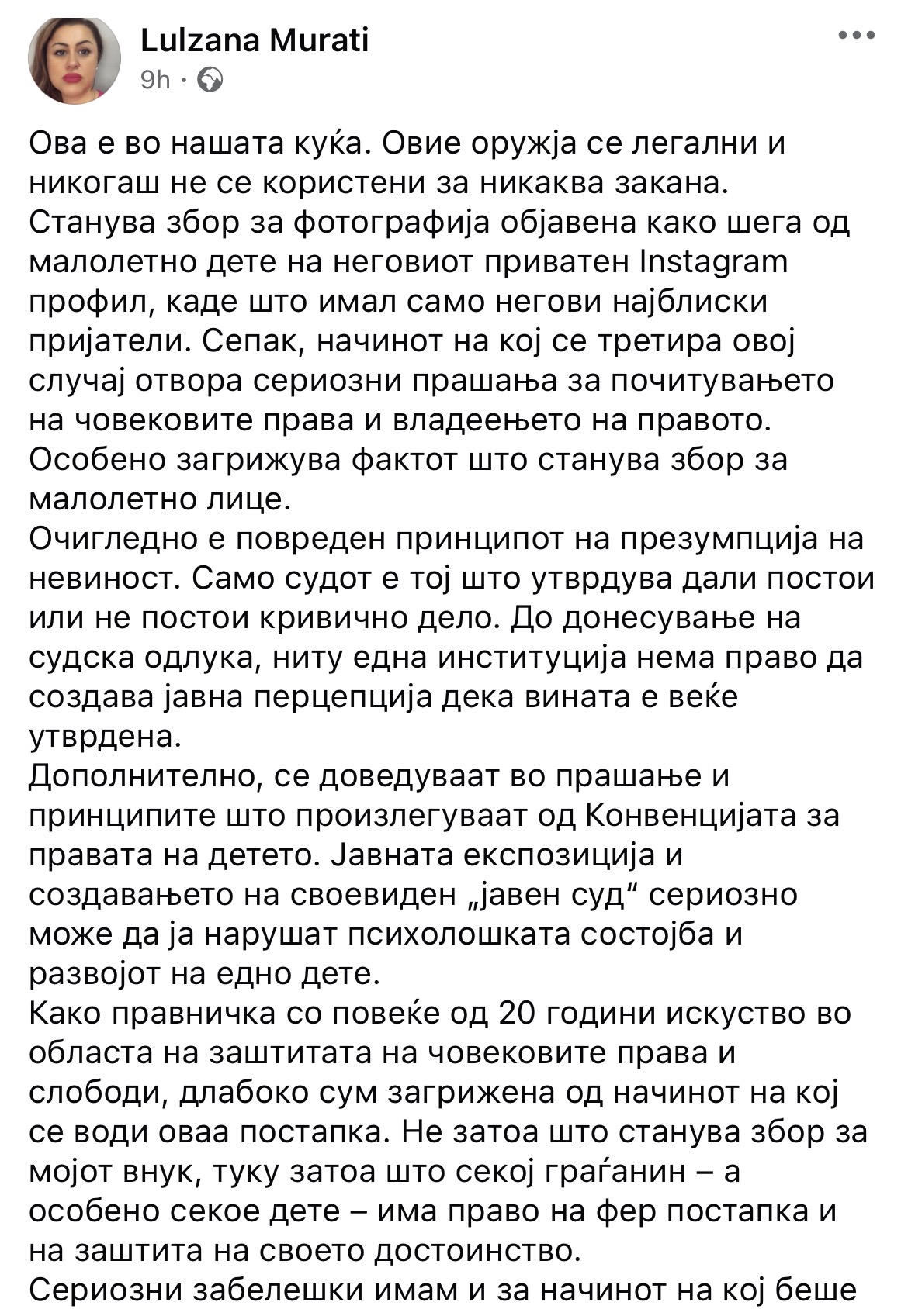 Përmes një reagimi në profilin e saj në facebook ka reaguar, Lulzana Murati, halla e 15-vjeçarit dhe juriste me 20 vite përvojë në fushën e mbrojtjes së lirive dhe të drejtave të njeriut në institucionin e Avokatit të Popullit, hedh poshtë pretendimet për kërcënime dhe thotë se bëhet fjalë për një fotografi të postuar nga i mituri në profilin e tij privat në Instagram.
