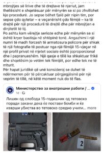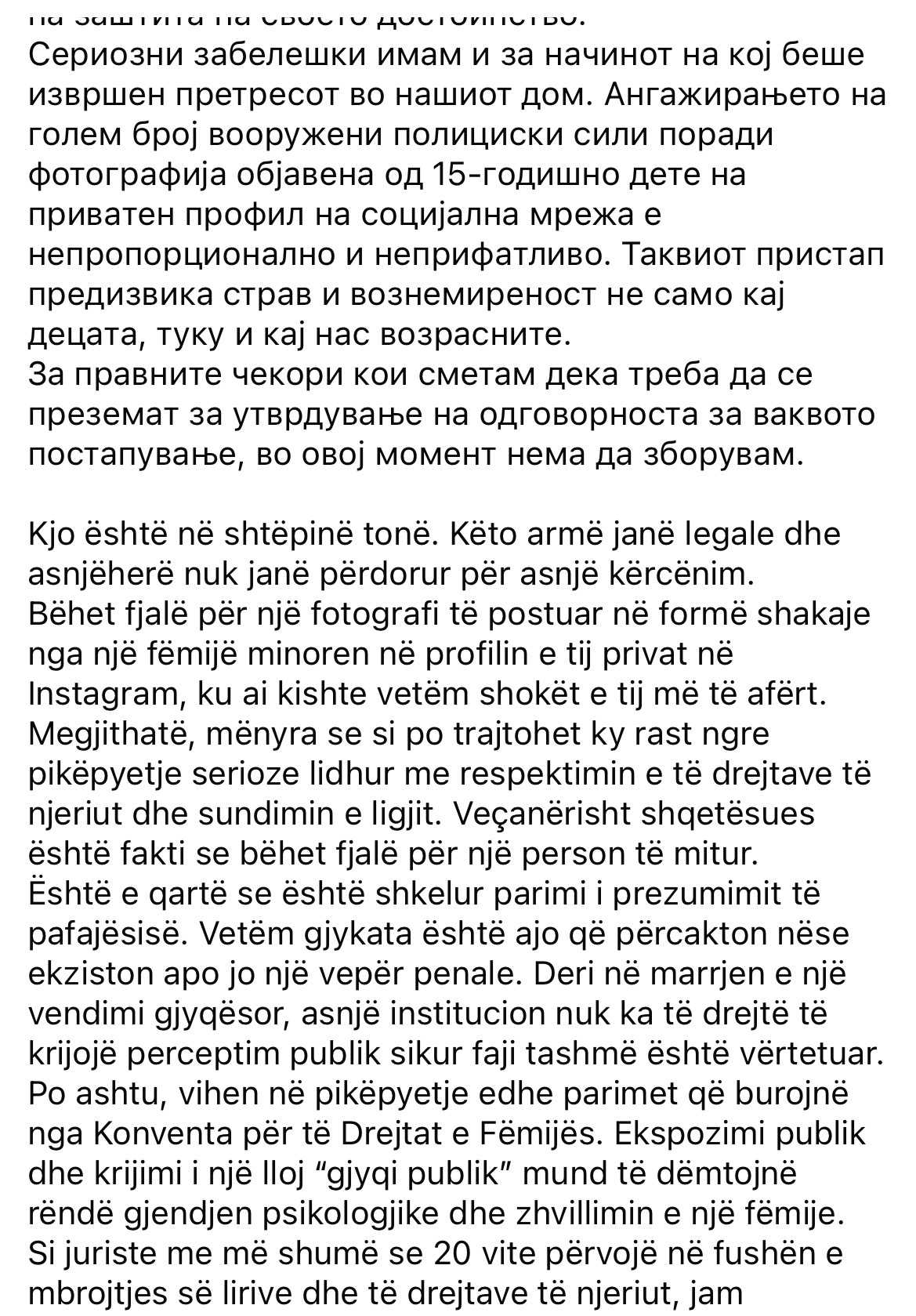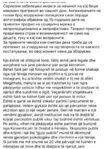 “Angazhimi i një numri të madh forcash të armatosura policore për shkak të një fotografie të postuar nga një fëmijë 15-vjeçar në një profil privat në rrjetet sociale është joproporcional dhe i papranueshëm. Një qasje e tillë ka shkaktuar frikë dhe shqetësim te fëmijët dhe familjarët”, thuhet në reagim.
