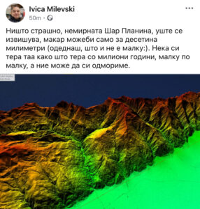 “Nuk ka asgjë të frikshme, Mali Sharr jo i qetë vazhdon të ngrihet, ndoshta vetëm për rreth dhjetë milimetra (papritur, që nuk është edhe pak :). Le të vazhdojë siç ka vazhduar për miliona vjet, pak nga pak, ndërsa ne mund të pushojmë”, shkruan Milevski.