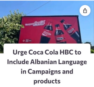 Peticioni kërkon që Coca-Cola HBC të respektojë gjuhët dhe kulturat e të gjithë konsumatorëve të saj, duke filluar me përfshirjen e gjuhës shqipe në dizajnet e produkteve dhe fushatat reklamuese.
