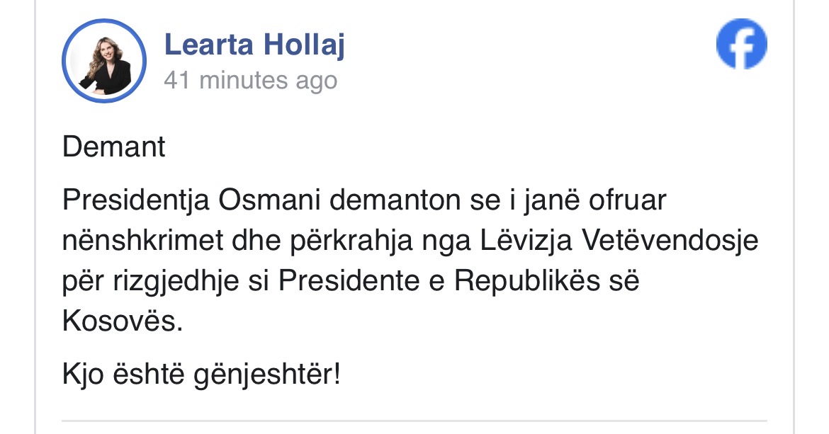 “Presidentja Osmani demanton se i janë ofruar nënshkrimet dhe përkrahja nga Lëvizja Vetëvendosje për rizgjedhje si Presidente e Republikës së Kosovës”.
