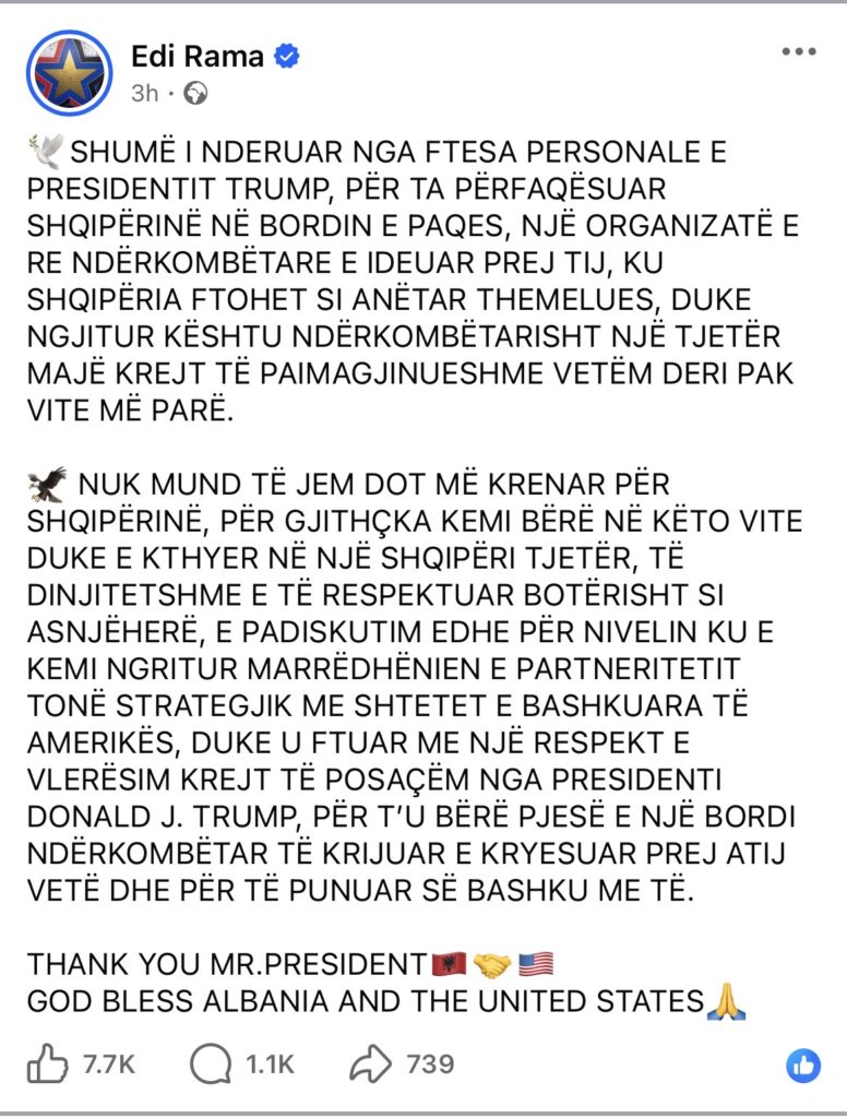 Nuk mund të jem dot më krenar për Shqipërinë, për gjithçka kemi bërë në këto vite duke e kthyer në një Shqipëri tjetër, të dinjitetshme e të respektuar botërisht si asnjëherë, e padiskutim edhe për nivelin ku e kemi ngritur marrëdhënien e partneritetit tonë strategjik me Shtetet e Bashkuara të Amerikës, duke u ftuar me një respekt e vlerësim krejt të posaçëm nga presidenti Donald J. Trump, për t’u bërë pjesë e një bordi ndërkombëtar të krijuar e kryesuar prej atij vetë dhe për të punuar së bashku me të.