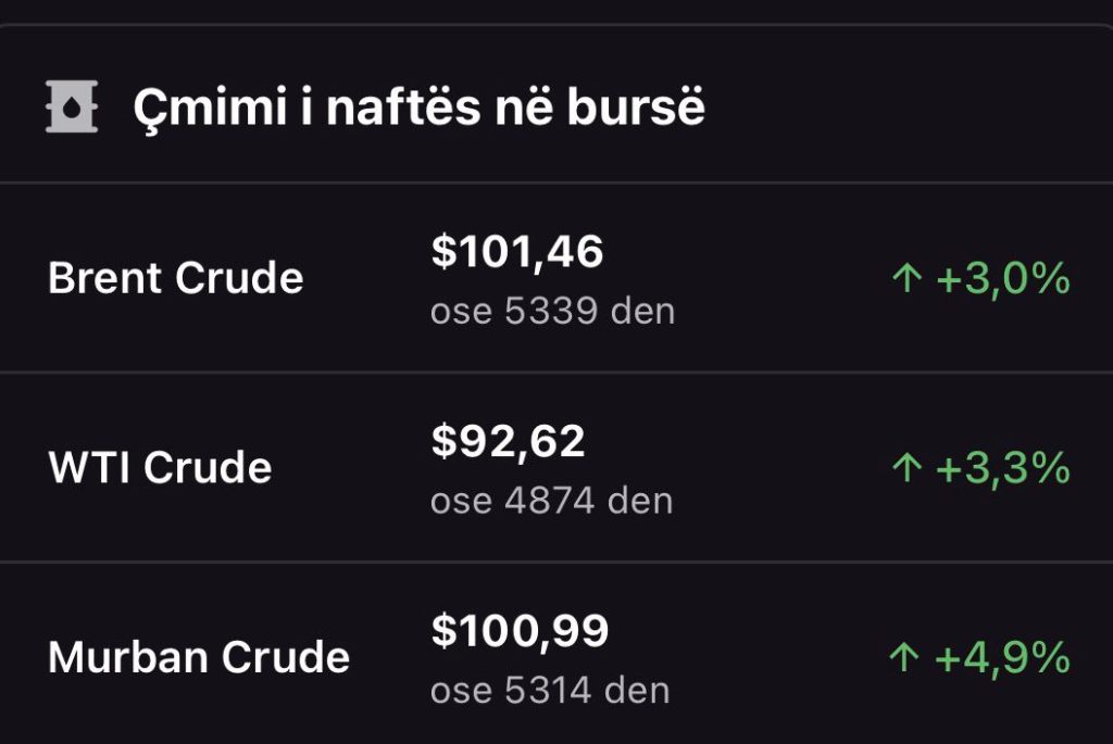 Çmimi i naftës ka shënuar një rritje të fortë në tregjet ndërkombëtare, duke arritur sonte në 101 dollarë për fuçi, shkruan Tema.mk. Ky nivel përfaqëson një rritje të ndjeshme krahasuar me ditët e fundit, duke reflektuar luhatjet dhe pasiguritë në tregjet globale të energjisë.