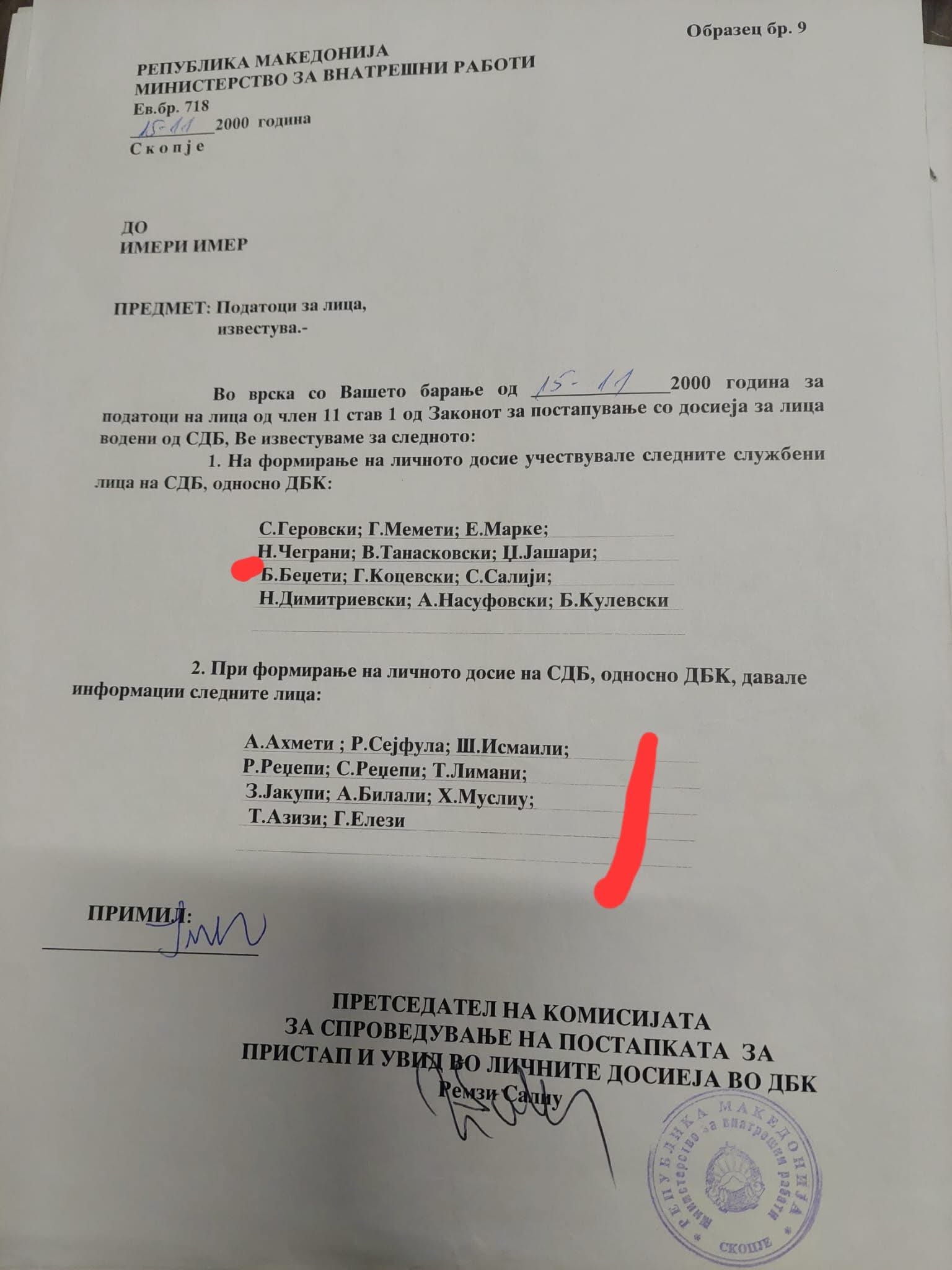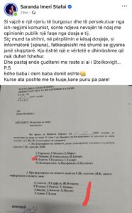 Deputetja e koalicionit VLEN, Saranda Imeri Stafai, ka ndarë me opinionin publik një pjesë nga dosja e ish-shërbimit sekret jugosllav(UDB-së) për babanë e saj, Imer Imeri, i cili sipas saj ka qenë i burgosur dhe i persekutuar gjatë regjimit komunist, përcjell tetova1