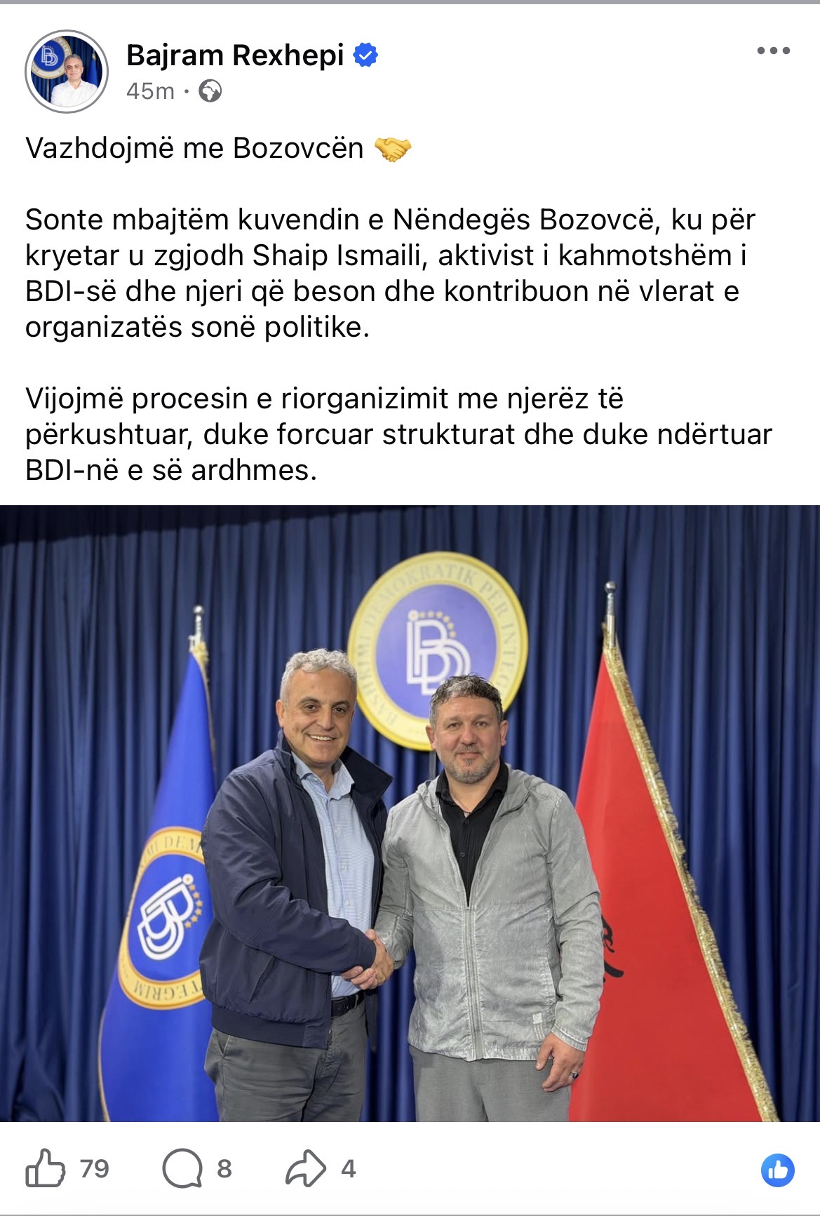 Sonte mbajtëm kuvendin e Nëndegës Bozovcë, ku për kryetar u zgjodh Shaip Ismaili, aktivist i kahmotshëm i BDI-së dhe njeri që beson dhe kontribuon në vlerat e organizatës sonë politike.