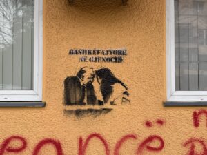 Në grafit është presidentja Vjosa Osmani dhe presidenti amerikan Donald Trump dhe mbishkrimi “Bashkëfajtorë në gjenocid”