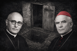 Pse nuk tregoni me cilët kriminelë jeni të lidhun dhe u keni çue bukë ndër male”? Nuk kanë pritë përgjigje por janë drejtue nga një gropë gjirizi të nevojtores së Seksionit, që ishte gjithmonë e hapun. Kanë urdhnue me afrue priftnit tek gropa. Këta që po shihnin nga dritaret po mendonin se po u bëhej presion me tregue… por, papritmas Asllani i ka vue duert në gjoks Don Pjetrit dhe Pali, ka kapë përkrahut Don Aleksandrin dhe, tue ua sha Zotin me fjalët ma të flliqta, veç kur u kanë dhanë të shtymen të dyve e, kanë ra mbrendë në gropën e zezë.