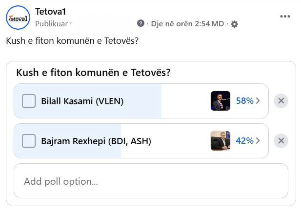 Zgjedhjet lokale po afrohen dhe temperatura politike nëpër komuna po rritet dita-ditës. Një nga komunat më të rëndësishme në këtë garë është Komuna e Tetovës, ku tashmë janë bërë publike emrat e kandidatëve që do të përballen për postin e kryetarit të komunës. Në këtë kontekst, platforma online “Tetova1” ka realizuar një sondazh 24-orësh për të matur preferencat e qytetarëve mes dy kandidatëve kryesorë: kryetarit aktual të Komunës, Bilall Kasami nga koalicioni VLEN, dhe sfiduesit të tij Bajram Rexhepi nga rradhët e BDI-së.