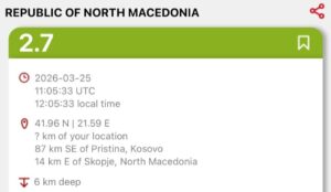 Në Maqedoni, këtë mesditë është ndjerë një tërmet, përcjell TV21. Qendra Sizmiologjike Euro-Mesdhetare e ka evidentuar tërmetin me magnitudë 2,7 ballë, në rajonin e Shkupit, konkretisht 14 km në lindje të Shkupit, me thellësi prej 6 km.