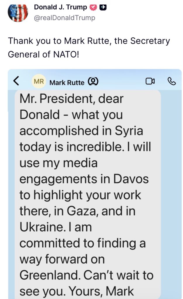 Në këtë mesazh, Rutte e lavdëron Trump për rezultatet e arritura nga administrata e tij në Siri dhe thekson se do të përdorë paraqitjet e tij në mediat ndërkombëtare gjatë forumit të Davosit për të nxjerrë në pah punën dhe angazhimin e SHBA‑s në Siri, në Gazë dhe në Ukrainë.