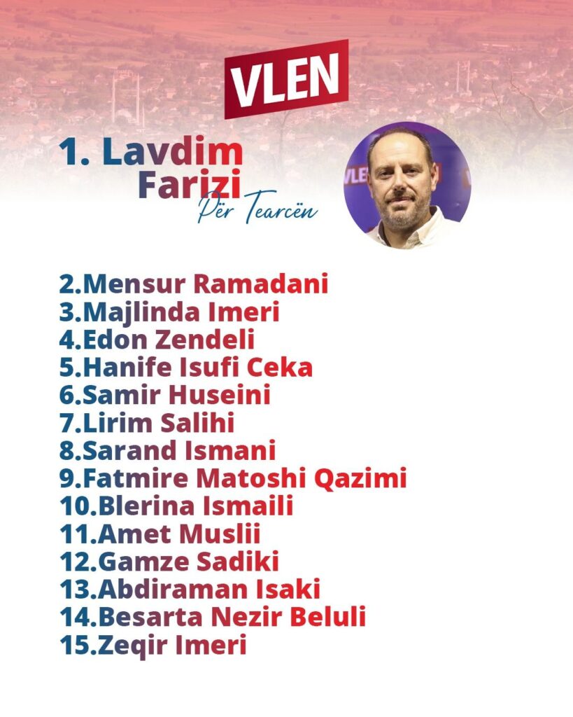 Koalicioni opozitar VLEN ka publikuar listën e plotë të kandidatëve për Këshillin Komunal të Tearcës, në prag të zgjedhjeve lokale që do të mbahen më 19 tetor në Maqedoninë e Veriut.