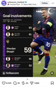 Sipas të dhënave të publikuara nga SofaScore, mes futbollistëve të ligave kryesore evropiane në dy sezonet e fundit, Shaqiri renditet i treti për involvime në gola, pas Harry Kane (63) dhe Kylian Mbappé (61), me 59 gol-e dhe asistime.